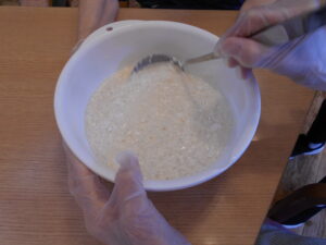 小麦粉、砂糖、水を入れ、よくかき混ぜます。