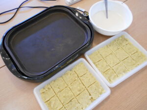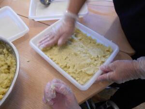 砂糖も入れ、バットに潰したさつまいもを伸ばします。