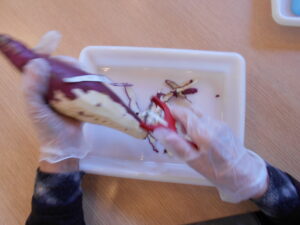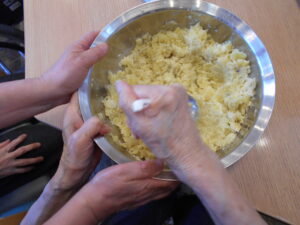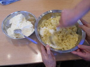 ここからは力作業です。ご利用者様に順番に潰して頂いている様子です。「これは疲れるな」「交代しましょうか」「お願いします」と、皆様協力してされていました。アイスクリームは、そのまま食べたいと要望が出ましたが、今回は芋に混ぜる事をお伝えすると、「しょうがないな」「こっちに混ぜても美味しいよ」と、残念がっている方もいらっしゃいました。