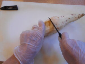次は剥いたさつま芋を小さく切ります。包丁を使うので、職員見守りながら切って頂きました。