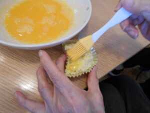 アルミカップにさつま芋を乗せ、溶き卵を塗っています。「たくさん塗りたい」「このぐらいかな」と、とても楽しそうですね。