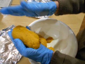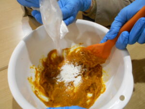 まず、ご利用者様には、事前にふやかしたかぼちゃを潰していただく作業をしていただきます。