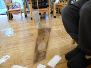 12月も後半に差し掛かり、今年もあと少しとなりました。きらめき館新館では、レクリエーション活動で、お金釣りゲームを行いました。お金を釣り上げて、合計金額を競い合うゲームです。