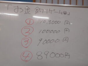 結果はチーム1の勝利です。「やったー」「勝ったよ」と、大喜びです。10万円以上も獲得されていました。大好評のため、後日また行いたいと思います。