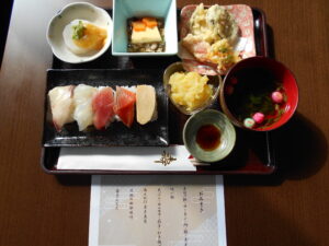 お寿司・お吸い物・天ぷら・あんかけ玉子豆腐・大根の田楽味噌・栗きんとんです。