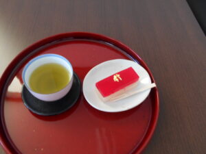 余興が終わり、ホッと一息、おやつの時間です。手作り紅白羊羹です。