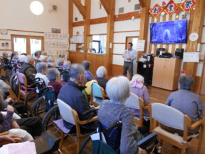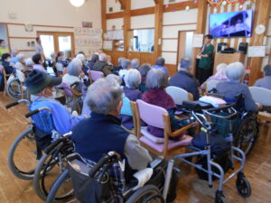 皆様、真剣に聞かれていました。社長の挨拶の後は、ボランティアの方による余興です。