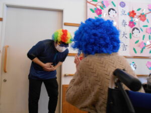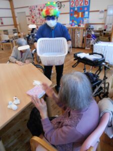 職員が鬼になり、ご利用者様には、鬼に豆ではなく、豆に似たてた玉で籠に入れていただきました。