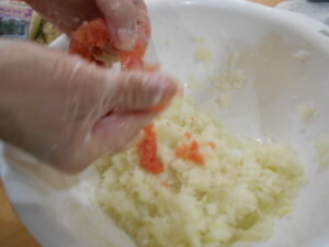 よく水を切った大根おろしに、明太子、チーズ、片栗粉、小麦粉を入れます。