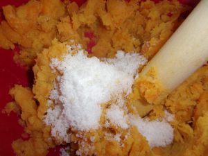 次に、砂糖・塩・バターを加え、もう一度しっかり潰し、牛乳を加えました。